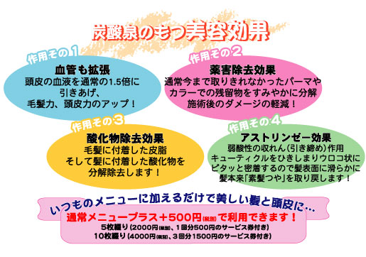 髪や地肌の汚れをしっかりと落とし、地肌の血行を良くすることは、健やかな髪を育てる基本です。炭酸で洗うと、お湯だけでは落ちにくい髪や頭皮の汚れがきれいに取れるから髪本来のピュア(純粋)な美しさに。“ピュア髪”にすることで、パーマやカラーなどの薬剤が効果を発揮しやすく、仕上がりも、さらさら、ふんわり、つやつやに!