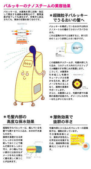 今までの美容器具では補給することができなかった結合水を髪に入れることができ、髪に必要な栄養分を全て補給することができるようになりました。更にこれまでのカラー剤やパーマ剤は薬剤を浸透させるためにキューティクルを開く作業を、髪に負担のかかるアルカリ剤で行なっていましたが、その役割を水で行なっています。